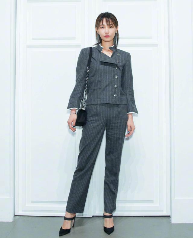 女强人形象偶然也需求切换一下,清新的邻家小姐姐也HOLD得住。浅灰绿色内搭和同色小香风外套,下半身红白条纹拖地长裤,份额十分的优异,大长腿无人能敌。再配上香奈儿的小包包,撞色调配极端抢眼又不会突兀。
