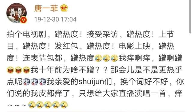 明星想要多接戏,不光要有实在的演技,更需要有必定的知名度,为此许多演员凭借各种论题来让自己上热搜,以此来进步自己的知名度。最近,唐一菲从头注册了新微博账号,发文十分的活泼,回应十年小三论题,并且又回怼自己蹭热度,不过唐一菲并没有要复出的意思,却一度在热搜榜单。