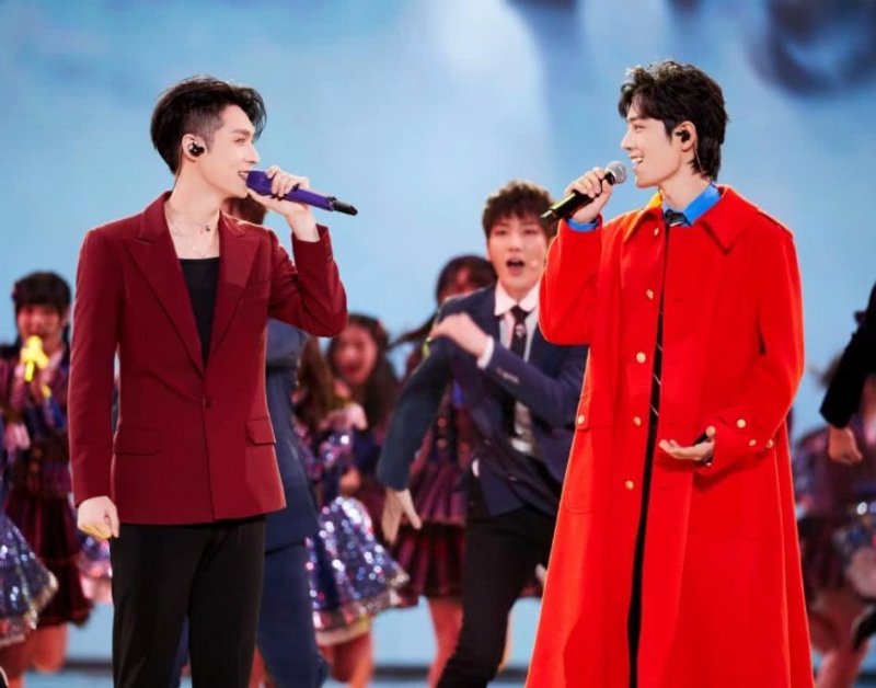 肖战和张艺兴两位正能量实力偶像同台合唱霸气开场,瞬间点着全场,同穿红衣,颜值气质在线,画面非常养眼吸睛,侧颜杀+笑脸杀,温暖又英俊。