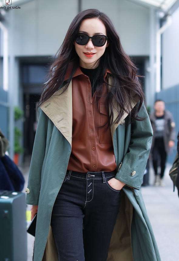 近来现身机场的女星韩雪一身大衣叠穿的穿搭造型十分的吸睛,一件绿色系的中长款风衣外套内搭上焦糖色的皮质衬衫以及一件黑色的打底,下装是一条牛仔原料的黑色九分裤,调配一双马丁靴,这样的调配看起来特别有一种自在欧美范儿的感觉,并且全体造型的层次感很丰厚,既保暖又时尚。