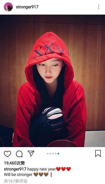 在某交际渠道上,关晓彤宣布几张身穿赤色卫衣和破洞牛仔裤的相片,并附文:happy new year ,will be stronger(新年快乐,会愈加强壮)。