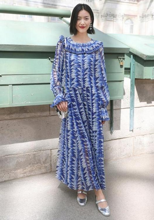 一袭蓝色波涛纹雪纺连衣裙似乎让还在感触隆冬的咱们瞬时穿越回了夏日,领口、袖口、裙摆都有百褶边的规划,凸显了女人的柔美气质,有一种飘飘欲仙的感觉。长到脚踝的长度特别显细长,除了这身蓝色连衣裙,鞋子、耳环、包包的颜色都是蓝色,全体调配调和,穿出了在海滨休闲休假的舒适感。