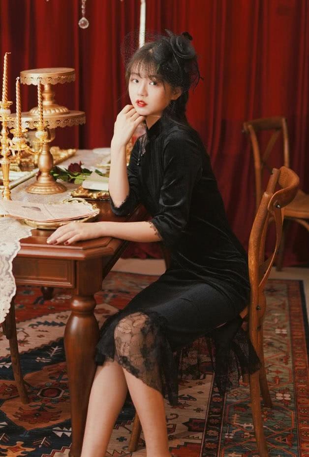 假如不知道穿什么色彩,黑色总是没错的,这一袭黑色的丝绒旗袍裙精约大方,精美的绣花包边打破了单色的烦闷感,勾勒出全体的概括,更显复古高雅的神韵,立领装点盘扣,莹润的珠子镶嵌,温润动听,不张不扬,慢慢释放出矜贵内敛的淑媛风情。