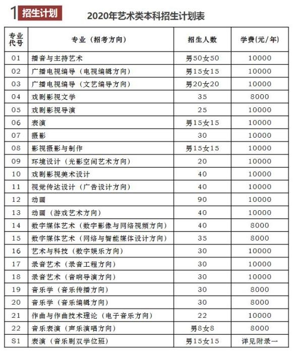 2019年11月,我国传媒大学就发布了2020年艺术类本科招生简章。其间,扮演专业方案招生男生15人、女生15人。比较于上一年度招生方案,中传扮演专业招生人数有所添加,男生、女生各添加两个名额,一共添加4人。