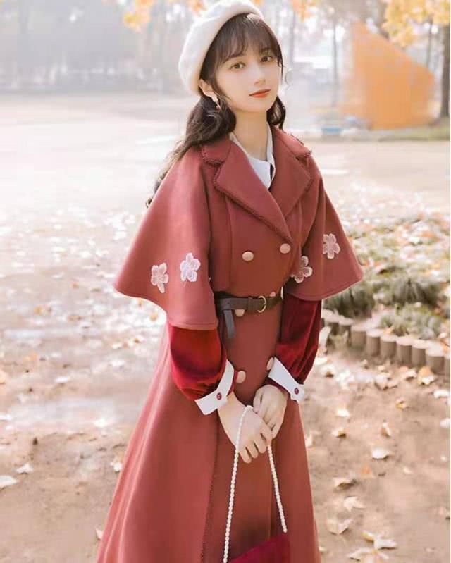 虎哥就十分喜爱这种带个小大氅的大衣,显得十分正经,也很高雅,最合适性情温顺的小姐姐来穿了。这件大衣的色彩并不是特别张扬的正赤色,而是略微带一点橘调的赤色,这个色彩看起来会更显白,也更低沉一些。最重要的是这个色彩看起来就很生动,年青一些的姑娘穿也肯定没问题。在大氅边际还有十分精美的樱花刺绣,看起来十分少女。