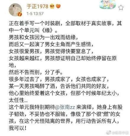 说他的新剧本创意来源于实在故事,男孩和女孩因戏结缘发生爱情,女孩很爱男孩,男孩觉得窒息。女孩越来越红,男孩想证明自己却停在原地。