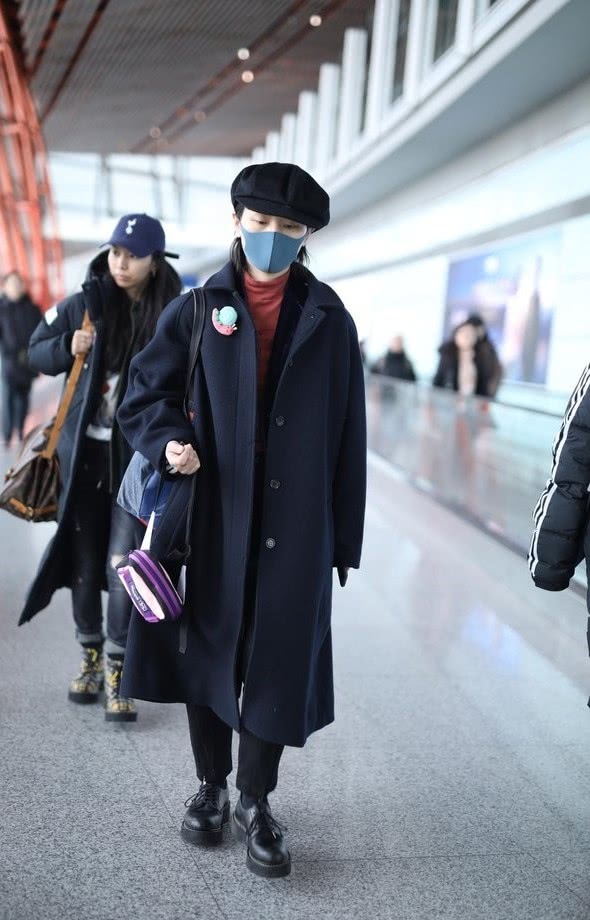 周笔畅身着过膝大衣调配长腿裤来穿,仍是最时髦最具有气场的,周笔畅上身穿一件蓝色的过膝大衣,下身穿黑色的长裤,很有中性的英俊感。为了打破暗色彩系的烦闷和单调,周笔畅挑选了一件铁锈赤色的高领套头衫来提亮全体视感,再调配上五颜六色小包包,更加减龄又香甜,头戴黑色八角帽,与脚上的黑色圆头马丁靴色彩上下照应,复古又炫酷。