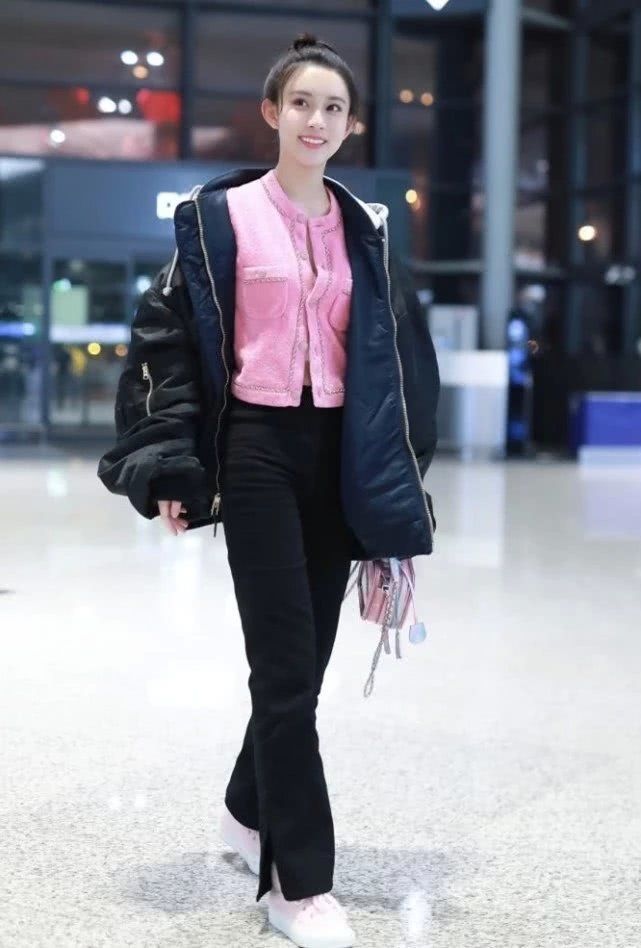 孟子义的身上穿了一件黑色的外套,里边还有一件粉赤色的上衣,再结合身上黑色的长裤,就像是校服裤的风格相同,把她的气质和老练的感觉很好的展示出来,不过腿也是很纤细的啊。