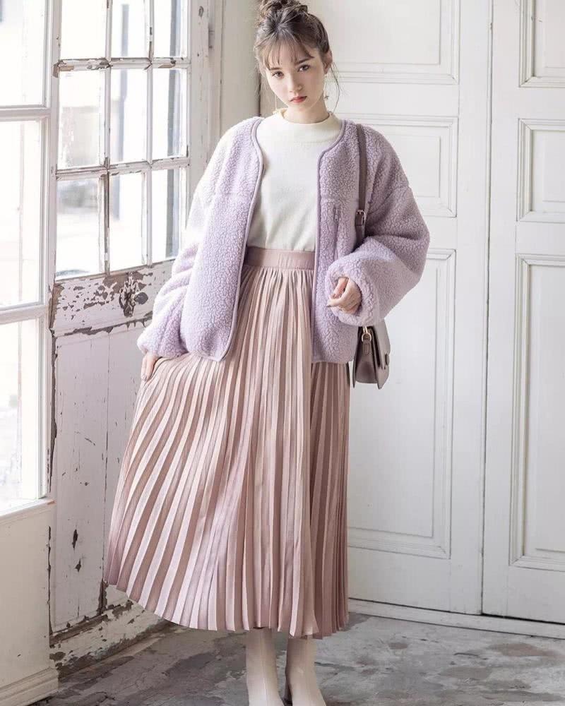 想要穿出高挑感,上短下长的风格是最美观的一种类型,挑选上衣的时分能运用宽松的款式,蝙蝠袖的毛衣开衫,表现出来的便是一种自在与洒脱,v领的规划会让内搭服饰更简略被展示出来,显得很有层次感。一件米黄色的褶皱裙很显女性味儿,这样的调配超显气质。