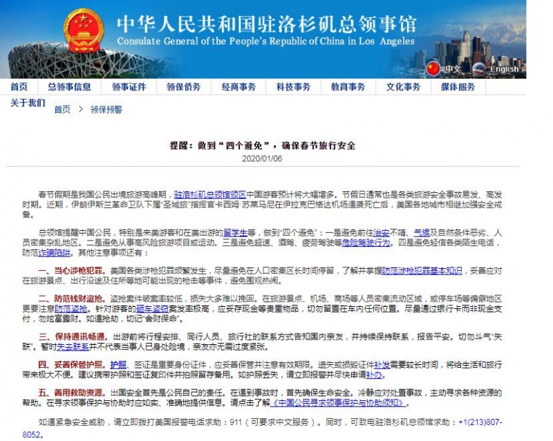 1月6日,驻洛杉矶总领事馆发布音讯称,春节假期是我国公民出境游览高峰期,驻洛杉矶总领馆领区中国游客估计将大幅增多。节假日一般也是各类游览安全事端易发、高发时期。近期,伊朗伊斯兰革新卫队部属“圣城旅”指挥官卡西姆·苏莱马尼在伊拉克巴格达机场遇袭逝世后,美国各地城市相继加强安全警戒。