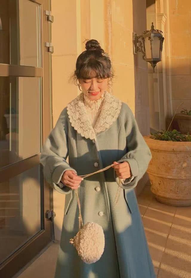 大衣的版型是十分高雅的赫本风版型,穿在身上十分立体,由于全体样式比较宽松,又会有一种十分灵活的感觉。大衣领口的方位镶嵌了白色的蕾丝花边,花边全体纹样是蔷薇形状的,看起来十分高雅。大衣的袖口做了小灯笼袖的规划,心爱又遮肉,很适宜手臂比较粗的女生。