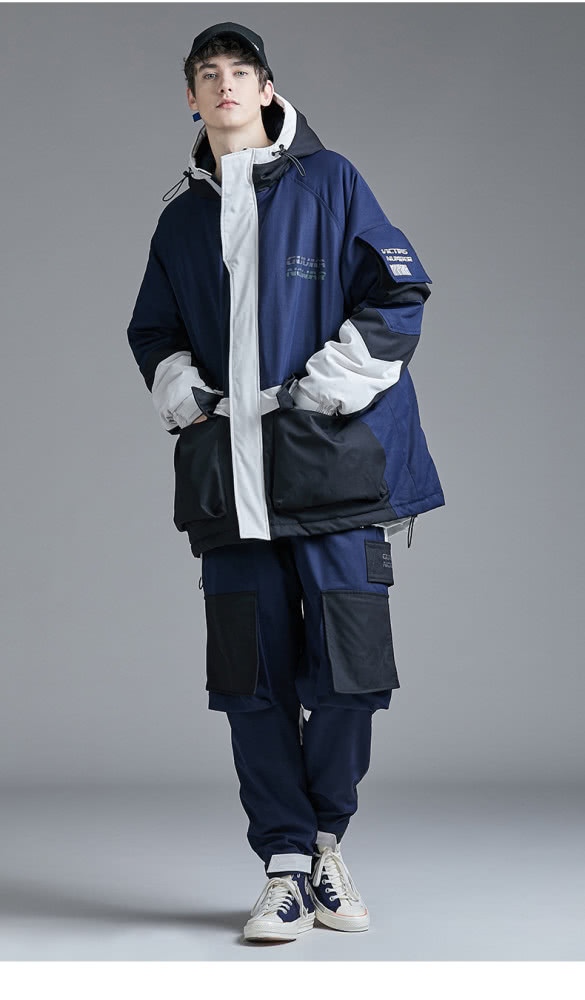 运动风穿搭,给人的感觉带着极强的画面感,对一向的运动风的认知为,纯度高的颜色,帽衫跑鞋弹力裤,穿上的感觉......这是要“操场跑圈”的节奏。但是当下时髦与运动的结合愈加严密,运动风融入各种时装元素已然不是什么新鲜事;此次国潮品牌以运动和工装结合的方法,来演绎街头运动潮流,上身拼接口袋连帽外套,下搭运动工装裤,全体的风格选用拼接及多口袋规划的方法来进行出现,黑蓝白色调组合,体现低沉沉稳,在拼接组合的方法下又不失生机;内搭选用白色刺绣毛衣,搭载一双是非阴阳高帮帆布鞋,把工装与运动完美联接,街头趣味十足。