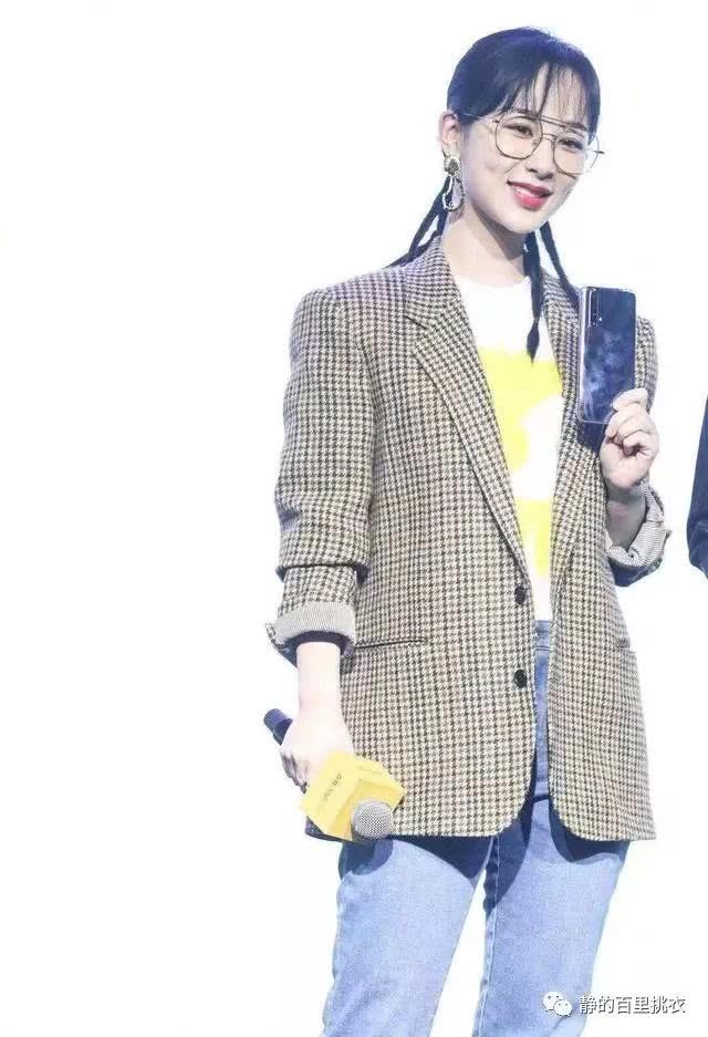 调配的是一条休闲的牛仔裤和一双白色的高跟鞋,这样的造型可以更好的展现出她的身段。这样的穿搭也是比较特性的,可以凸显出她的阳光少女感。单看这一件小格子西装有一点英伦风格,年纪大的女性也能轻松驾御。假如咱们把牛仔裤,换成西裤,整个造型就会看起来老10岁。
