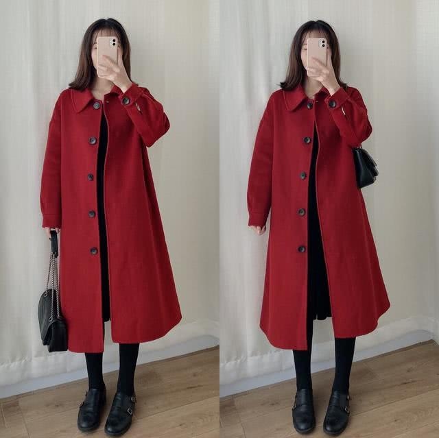长款的赤色大衣,内搭黑色打底,下身黑色打底裤+黑色鞋子,不管是短靴or长靴,视觉上都能够弱化赤色带来的冲击,并且黑色内搭最显瘦,红黑这对CP怎样都不会犯错,这么精约又大气的调配太合适新年穿啦!