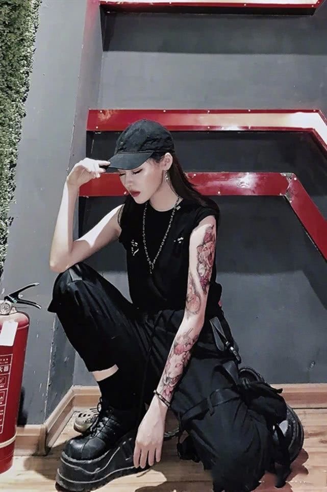 杨馥宇这次在微博上晒出的一身穿搭中穿了一身黑色的穿搭,头上戴了一个黑色的棒球帽,身上穿了一件黑色的无袖衫秀出纤细的手臂上也是纹身的痕迹,调配了一条黑色的工装裤,最抢眼的应该便是脚上穿的黑色的皮鞋了吧,鞋底下加了三层鞋底,穿起来非常的显腿长!