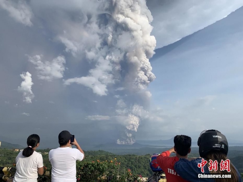当地时间1月12日,菲律宾马尼拉西南卡维特省的塔盖泰镇,民众在给迸发的火山摄影。当地时间12日,菲律宾旅游胜地大雅台邻近的塔尔火山开端喷射,火山灰高达10至15公里。