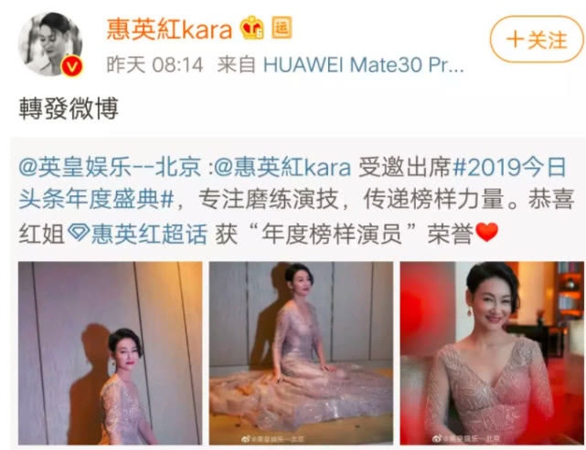 在最近的年度盛典中,在很多小花、大花中,年近60岁的惠英红却分外的引人瞩目。一身肉粉色的大V领长裙,十分有气质。而当晚惠英红还拿到了“年度典范艺人”的荣誉,可喜可贺。