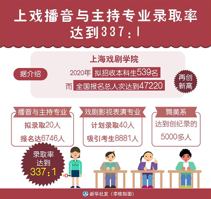 上戏招生办公室主任刘志新介绍说,本年“艺考”呈现新现象。上戏播音与掌管专业拟选取20人,报名达6746人,选取率到达337:1,力压戏曲影视扮演专业成为年度最抢手专业。而传统意义上的“造星”专业——戏曲影视扮演专业方案选取40人,招引考生8881人。