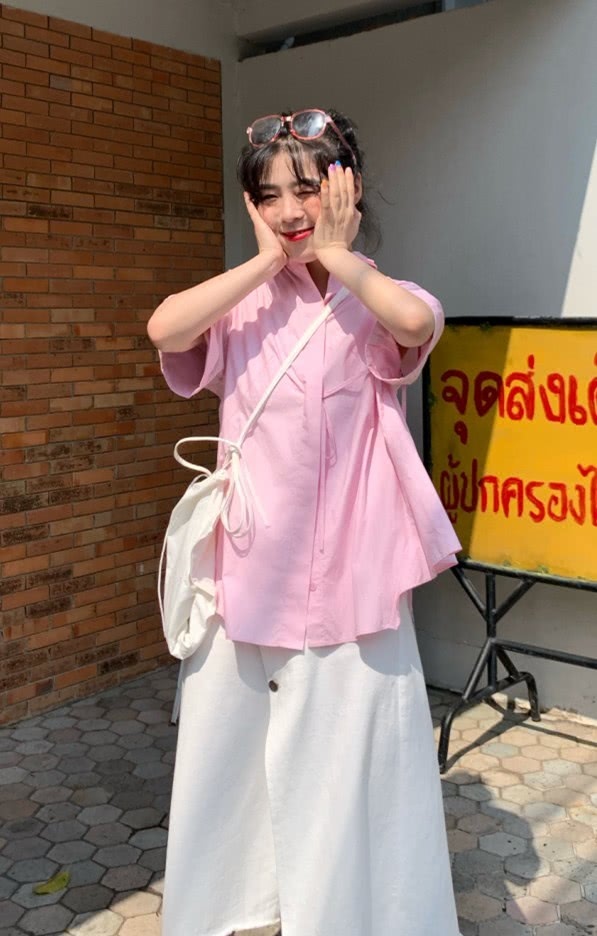 并且这款裙子很休闲的,有一种慵懒的感觉,调配简略的T恤就很美观了。小姐姐穿的是粉色衬衫+白色“椰奶裙”,增添了少女心,粉嫩的调配,很有吸引力。这件粉色的衬衫,归于纯色的样式,并没有其他的装饰品。