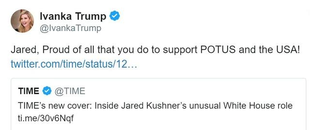 ▲伊万卡写到:“贾里德,我为你感到骄傲,你一向在为美国总统和美国做出奉献。”