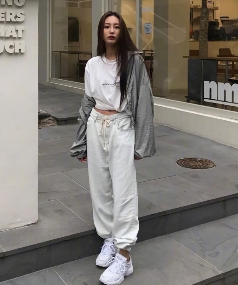 慵懒风还能够和其他的许多风格结合起来,并且造型调配百分百美观,还能显特性。灰蓝色的呢子外套是比较轻浮的样式,内搭白色的打打底,上半身的造型好像很简略干练;下半身穿的是一条灰色的宽松的萝卜裤,脚踩白色的平底鞋,还有白色的袜子,很随性的调配,这样的慵懒风特性十足,穿出门百分百吸睛。