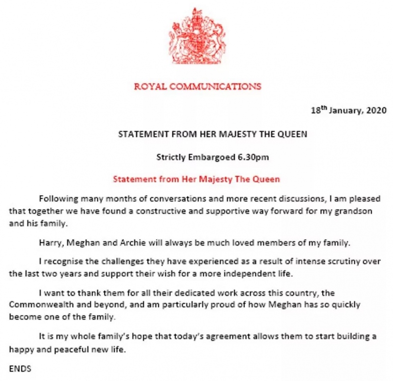 英国当地时刻1月18日,白金汉宫连发两份声明来奉告大众关于哈里配偶退出王室的终究协商成果。