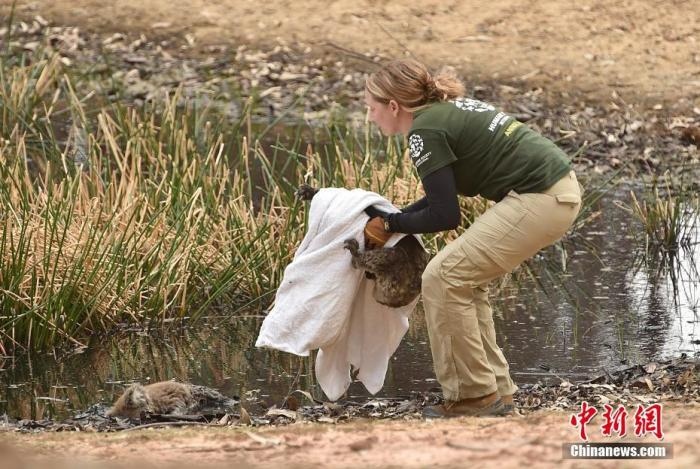 图为当地时间1月14日,一只受伤的考拉在承受烧伤医治后兽医正在帮它查看。