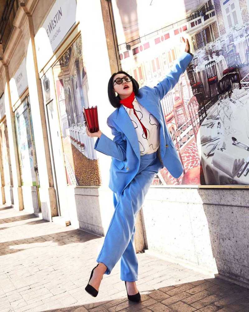 西服套装调配既定,上下单品联络严密,在风格方面也保持一致。将套装用于日常穿搭,既可以节约咱们的穿搭时刻,又能协助咱们穿出风格。仅仅黑灰白的套装很常见,挑选其它色彩会更亮眼。例如小S就为自己挑选了一套蓝色的西服套装,她还奇妙地运用了叠穿的办法,在内中用衬衫调配高领的赤色毛衣,透显露满满的时髦感。咱们在穿搭时,也可以运用穿搭办法或许在配色上多花些心思。小S真的超会穿!蓝色西服套装调配赤色毛衣干练时髦,真洋气。