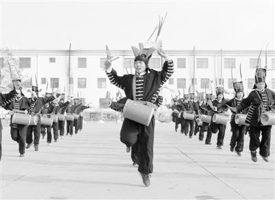 接近新年,喜庆的鼓声从甘肃省武威市凉州区四坝镇九年制校园的校园内传来。攻鼓子是发源于甘肃武威的一种民间鼓乐舞蹈,扮演风格淳厚豪放、威武雄壮,具有激烈的地域特征。2008年,凉州攻鼓子被列为第二批国家级非物质文化遗产。为更好地传承这项非物质文化遗产,该校组成攻鼓子艺术社团,开设攻鼓子校本课,定时由当地攻鼓子代表性传承人对学生进行辅导,推进“非遗”攻鼓子艺术教育遍及。图为学生正在操场操练攻鼓子。新华社记者 耿馨宁摄