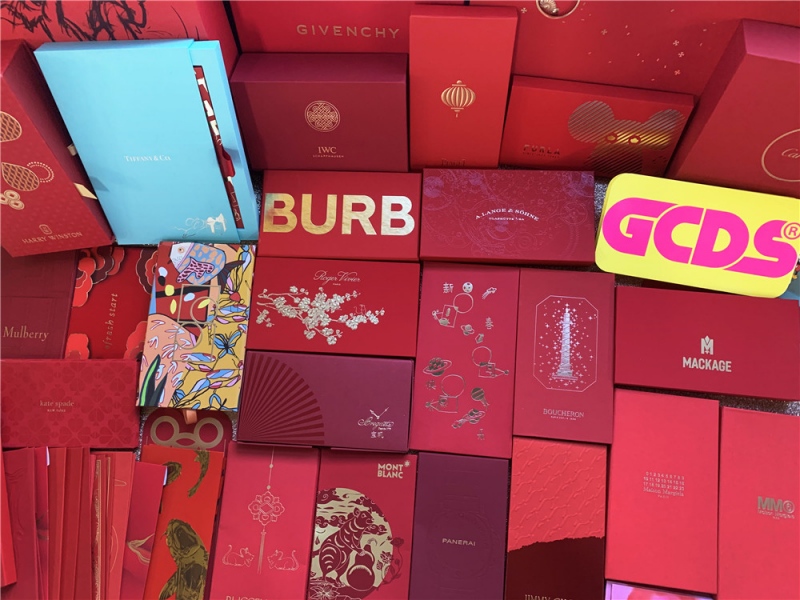 纪梵希本年的红包礼盒选用了翻盖式开合规划,烫金字体凸显在红包中心,花卉图画则作为底纹,谁说大LOGO就不能高雅?