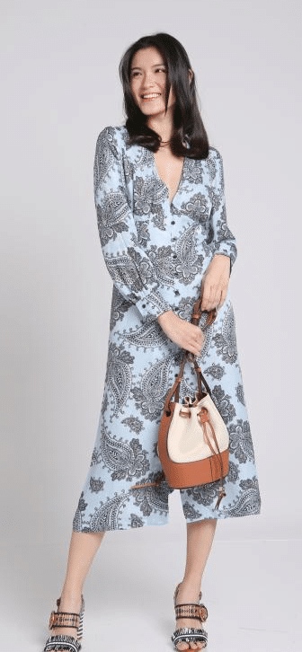 女生的连衣裙印有大片欧芹印花(parsley print)纹样,照应男装的花卉图画,明丽的休闲风给人很夏天的感觉。草编元素的高跟鞋照应全体色彩,再拎起一款水桶包,奔向一场夏天里的狂欢。