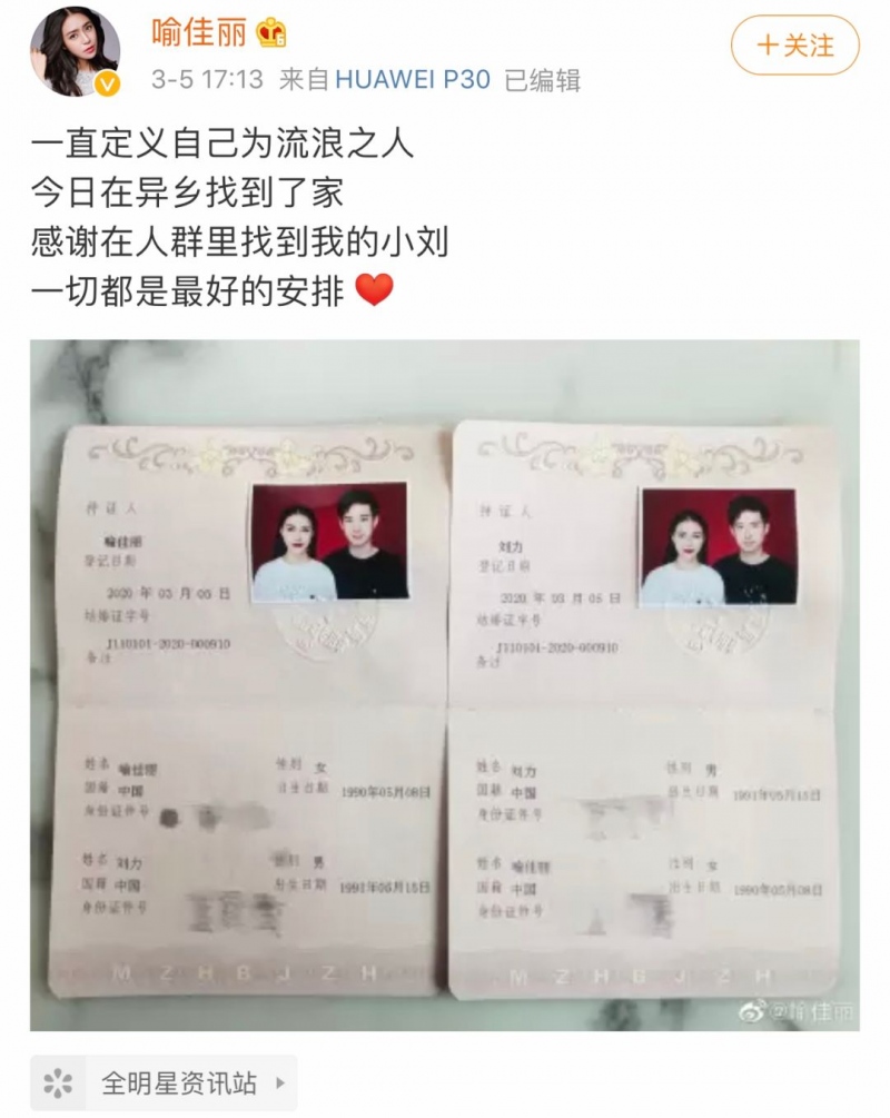 前两天2011届快女喻佳丽在微博发布了成婚的喜讯,直言“一向界说自己为漂泊之人,今天在异乡找到了家”,喻佳丽亲热地称其小刘,夸姣的感觉溢于言表。