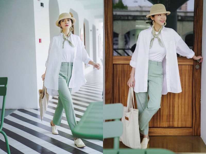 三木的这款时髦又简略的穿搭,一眼就觉得很美的感觉,白色的衬衫+白色的T恤,超简略的单品,可是配上薄荷绿的围巾,让全体造型瞬间变得新鲜又气质,还多了几分温顺感,下身挑选薄荷绿的西装裤,和围巾相照应,全体feel更新鲜更美了,似乎春天的一幅山水画,安静幽香,脚踏白色休闲鞋,休闲多了,所以说三木的这款薄荷绿色穿搭又美出了新高度,我们学着点吧,你也能够很美。