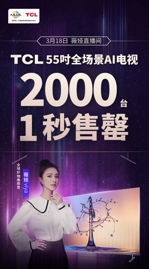 疫情特殊时期,许多企业将战线从线下转至线上,“云发布会”、电商直播荐货成为了品牌卖货的重要渠道。3月18日直播当晚,大国品牌TCL携智能电视走进全球好物推荐官薇娅Viya淘宝直播间。期间同时在线观看人数高达2074万+,在线下的电器城售价4599元的TCL电视,薇娅直播间只售2399元,下单送腾讯视频会员季卡,仅1秒钟,2000台TCL电视宣告售罄!