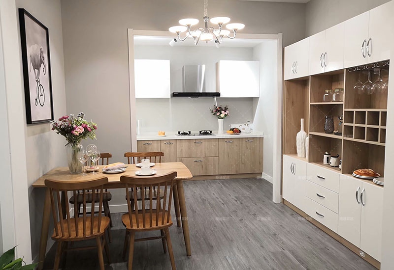 柜门选用滑润的亮面规划,白色与原木色结合,明晰靓丽,开放式厨房与餐边柜颜色和谐一致。