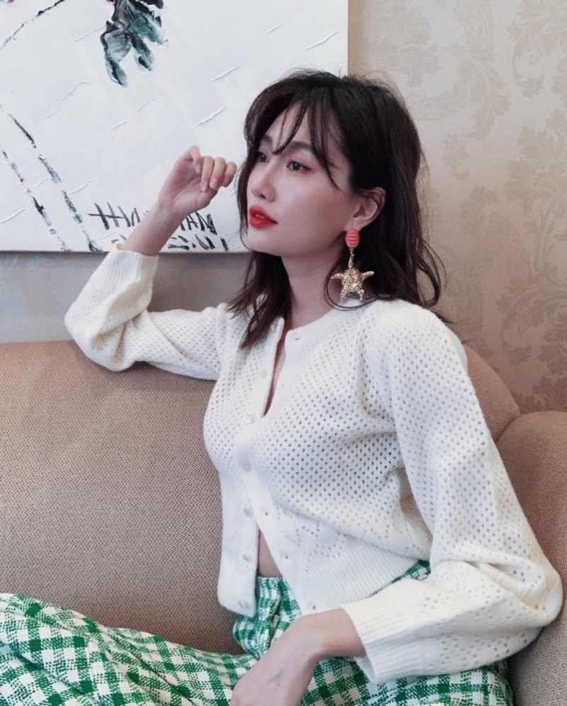 李斯羽上身穿白色镂空针织衫,衣身还配以菱格图画,新鲜精约又时髦洋气,短款的版型,视觉显高又显腿长,很是干练又不失女人的妩媚气味,下身调配同样是充溢高档感的阔腿裤,挑选用绿色白色的格纹元素,新鲜又复古,短衣阔腿裤的绝佳气质魅力组合,几乎开了挂,李斯羽手里还抱着卡通毛绒狗,童心未泯,幽默又灵动。
