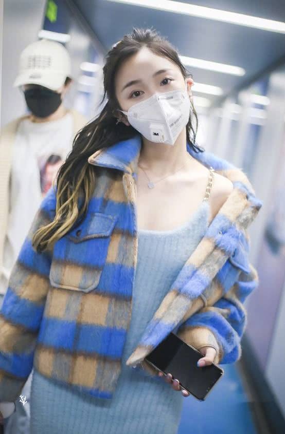 吴宣仪真是会穿!格纹短款外套调配浅蓝色针织短裙,时髦又大气
