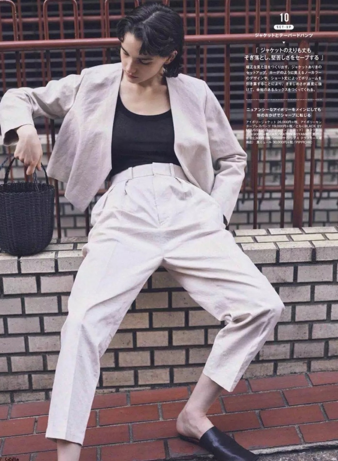 这样的色彩自带胀大感,所以在挑选裤子的时分,原料和坠感方面一定要妥当,取舍要修身一点。
