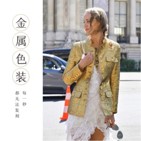 不管是长款外套,仍是短款外套,穿在身上,都别有风韵,魅力四射。不止如此,像T恤、衬衫、秋衣、这些简略备至的上衣样式,装点上金属色泽,都被赋予新的时髦,让你的衣品开挂