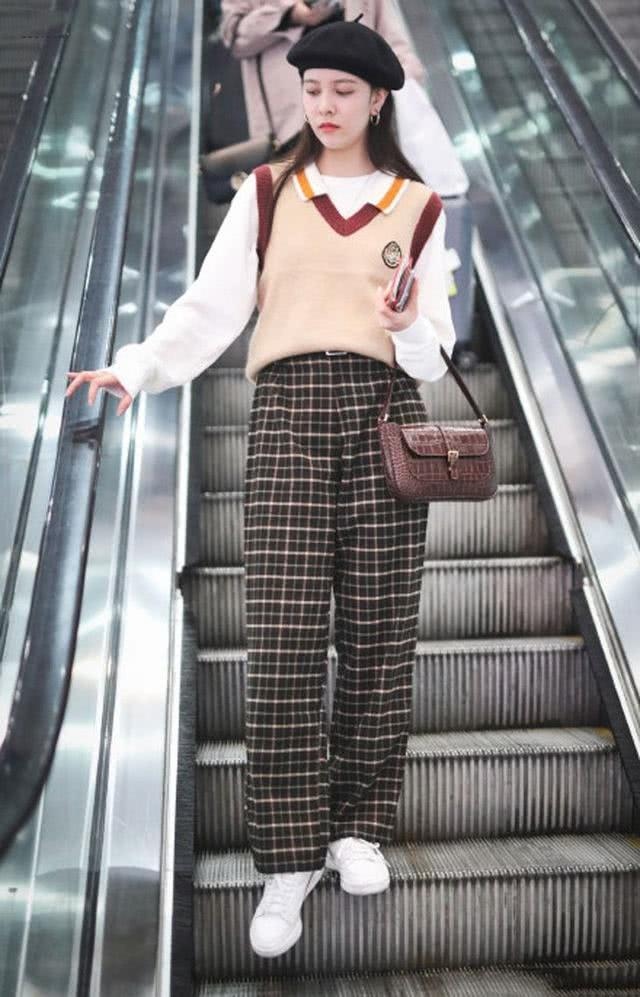 Jennie宋妍霏身穿经典白T,外搭充溢芳华特征的学院风V领针织马甲,来调配高腰格纹裤,脚上的一双小白鞋更是将学院风贯彻到底。而小皮包和贝雷帽的装点,又让全体look精约又不失幽默心爱,俨然一副复古风元素满满的学校小姐姐的容貌,对错常吸睛的调配。高腰格纹裤+V领针织马甲或毛衣的调配是绝不会犯错的,信任我!