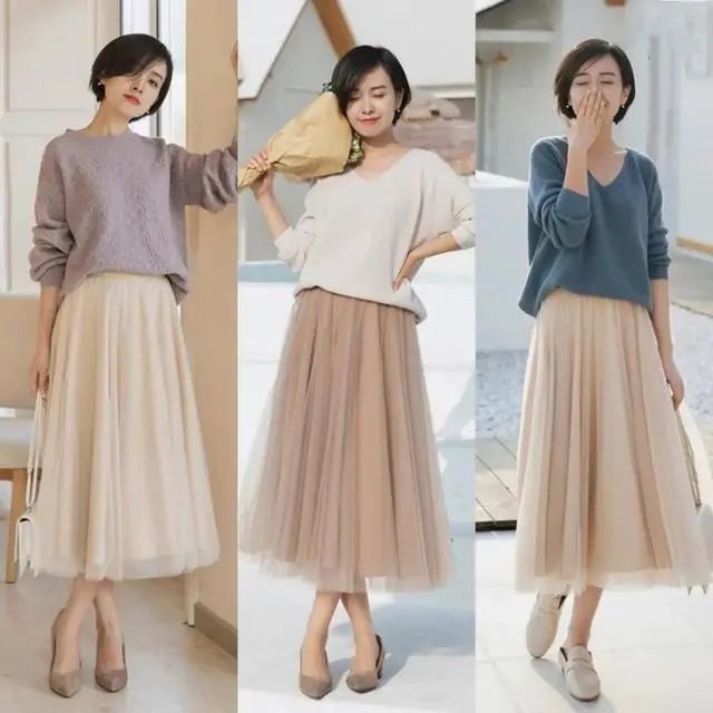 从下装的分类来讲,可大致分为裙装和裤装两大类,咱们先来看看裙装。不管是半身裙仍是连衣裙,无疑都能够穿出妩媚的女人味,能够为你温顺香甜的指数加分。关于潇洒的网纱半身裙,也很合适中年女性朋友,仙气十足又新鲜脱俗,上装调配一件休闲的针织衫,舒适极了,还遮肉显瘦。