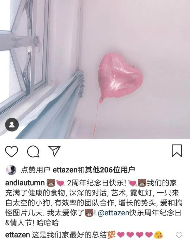 昨日,他们更新了交际渠道的动态。情人节那天,Andi发了一张他们卧室的相片,那应该是他们租的酒店。可以正常的看到一个粉红色的心形气球漂浮在屋顶上,满满少女心。