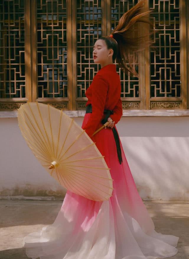 这套国风穿搭真得是又美又飒,宛如一位侠骨柔情的女侠客。"美女恨,斩妖魔。披发仗剑,千古有评说"诗中所说,大约便是赵露思的这套穿搭吧。这套穿搭选用宽腰带进行收腰,除了能润饰腰线,还能改进身段份额,然后给人视觉上的显高作用。宽松的裙摆可以刻画轻盈感,还能遮住肉肉的小腿,由赤色到白色的突变选用浅粉色为过渡色,尽显少女气味。潇洒的高马尾也为这套国风打扮添砖加瓦,妹妹不要忘掉撑一把油纸伞哦,更显国风神韵。这样的收腰大摆连衣裙真的很"小心计"呢。