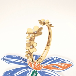 Frivole指间戒是另一枚绚烂之作。三朵经镜面抛光的黄K金花朵与铺镶钻石的花朵遥遥相对,似乎轻声倾诉诗意春日。不对称的灵动买卖,春意不经意地开放指间,这春日独有的灵动与活力将世家共同的买卖美学与风格再现。