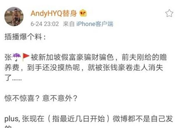 在6月24号深夜的时分,黄奕的前夫黄毅清在自己的交际渠道上发文,爆料说张雨绮被一位新加坡的贾富豪骗财骗色,就连同前夫袁巴元原刚给的一个生活费,张雨绮也被这位贾富豪给骗走了。并且这些生活费倒数还没有摸热,就现已被这个假富豪张钱豪给卷走了,现在张钱豪人也消失了,并且黄毅清还在发文傍边写,惊不惊喜,意不意味。