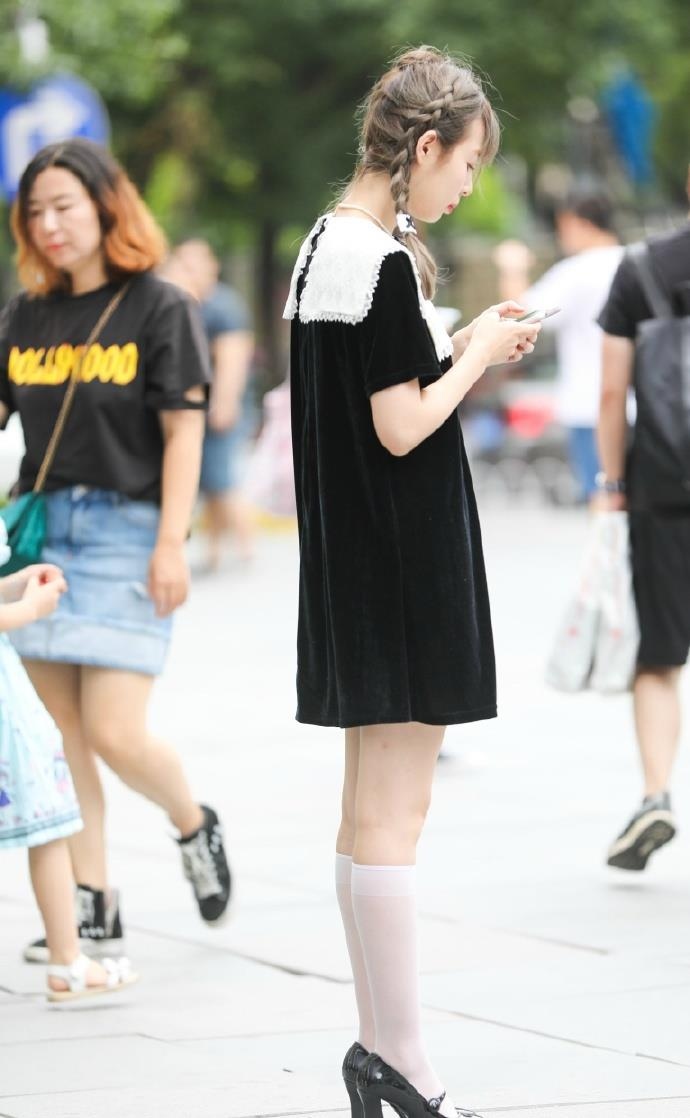 或许意识到风格刻画的重要性,小姐姐挑选在腿上穿一双白色的高脚袜,又调配复古式的黑色粗跟鞋,十分少女的调配,跟她的裙子风格很是类似,然后还选了一款像是“采蘑菇”用的竹篮相同的包包,打造出的少女感爆棚,真的特别像是神话中走出的心爱小妹妹相同,让人感到一阵温暖。或许小姐姐的年纪现已过了这幅装扮的最终年纪了,可是爱美的心是没有错的,尽力的在穿搭上完结自己曾经的愿望,让自己变成神话中的小公主,也是一种不错的体会吧,这相同也是穿搭的魅力地点。