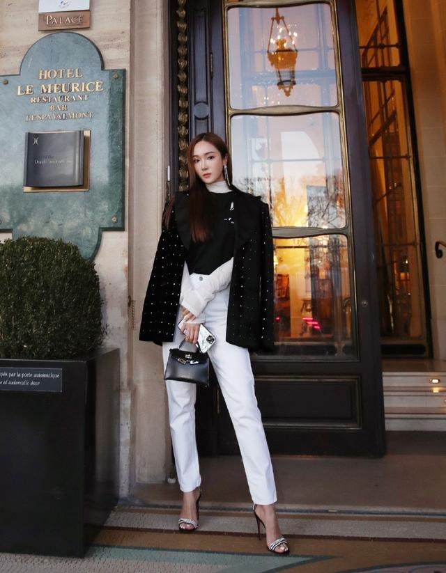 郑秀妍把黑色西装披在肩上,相对于穿戴,更简略给人一种英俊大佬的既视感,时有碎钻的装点,散发出点点星光,适当抢眼。下身调配一条白色的直筒裤,将内穿的高领衫塞进裤子,不只给人一种稳当有型的形象,还拉长双腿份额,显腿长,全体造型只需经典的对错色,精约又高级,单手插袋的pose,女王范十足!