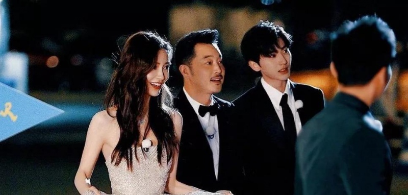 站在她周围的蔡徐坤,穿戴一身黑色西装,也适当英俊,由于Angelababy的裙子太长,蔡徐坤还很绅士地帮她提裙子。