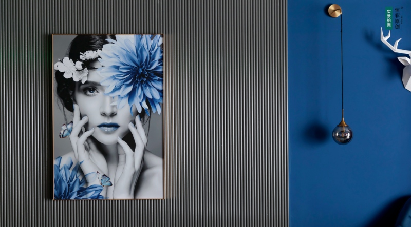 在配色上挑选视觉冲击感极强的深蓝色和橙色作为首要色系,结合当下盛行“民族之光”主题装修,以混搭的方法将北欧、现代、轻奢元素融入到一个空间里,以高纯度、高明度的颜色引导,给人一种燃爆、迸裂的视觉体会。