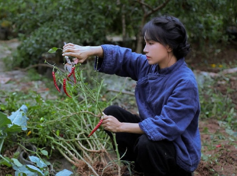 相片里边的李子柒穿戴一身深蓝色的粗麻上衣搭配上黑色的长裤,这样的打扮很像是抗日片里边的农人家庭里边的女性常常穿的衣服。显得很布衣又很舒适,很方便于做这些田园活。一头长发盘起来配上淡妆的李子柒感觉上还挺纯洁的,可是一双手的确满是尽力日子的痕迹,这点也让人不得不敬服李子柒了。仅仅有时分脱离滤镜,这样的造型很简单让她看起来像35岁的阿姨。